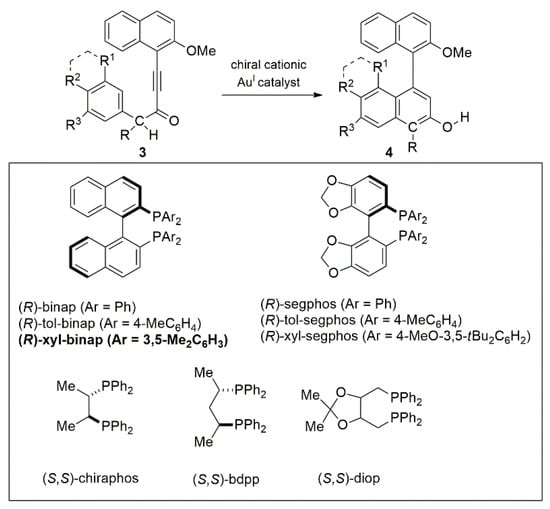 Tanaka’s group reported the gold-catalyzed intramolecular hydroarylation of alkynones (3) for the atroposelective synthesis of axially chiral all-benzenoid biaryls, 4-aryl-2-naphthol derivatives (4) [15]. Different chiral bisphosphine ligands in presence of gold(I) were evaluated (Figure 3). After optimization of reaction conditions in terms of Au complex, ligand and silver salt, the cationic gold(I)/(R)-xyl-binap complex in combination with AgOTf proved to be the best system for the atroposelective intramolecular hydroarylation of several alkynones variously substituted.
