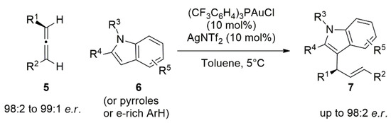 In 2018 Lee and co-workers reported the first example of intermolecular hydroarylations of allenes with efficient axial-to-point chirality transfer [16]. After optimization of the reaction conditions, a wide screening of the enantioenriched allenes (5) and the aryl- and heteroaryl-nucleophiles (6) was conducted affording the corresponding products (7) in excellent yield and regio- and enantioselectivity (Figure 4). It is worth noting that such reactions were previously reported by Widenhoefer [17] and Che [18] to occur with no chirality transfer under gold-catalysis due to competing gold-catalyzed racemization of the allene substrates. Studies about the hydroarylation versus racemization rate were conducted proving that the chirality transfer is efficient under the reaction conditions described by the group because it outcompetes the rate of gold-catalyzed allene racemization.
