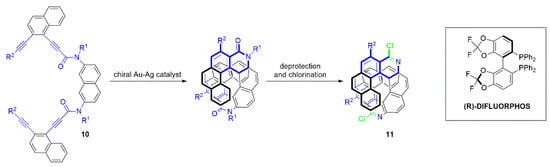 As mentioned before, the asymmetric gold catalyzed hydroarylation turned out to be a very useful method for the enantioselective synthesis of helicenes. In 2016 the group of Tanaka exploited the gold-catalyzed intramolecular quadruple hydroarylation of a tetrayne for the enantioselective synthesis of an aza[10]helicene (11) [20]. Screening of axially chiral biaryl bisphosphine ligands revealed that the gold(I) complex obtained from AuCl(SMe2) and the electron-deficient difluorphos ligand was the best system for achieving both high yield and ee values. It is noteworthy that also the suitable choice of the silver salt and its quantity play a key role in the success of the reaction. Employment of one equivalent of AgOTf with respect to the gold(I)complex gives a monohydroarylation reaction, while the use of 1.5 equivalent leads to the desired quadruple hydroarylated product. The subsequent deprotection and chlorination provided a fully aromatic aza[10]helicene, possessing two pyridine units (Figure 6).