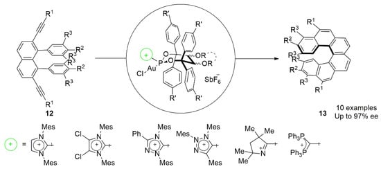 In a later work (2018) by the same group, a similar catalytic system was used to achieve the enantioselective synthesis of fully benzenoid single and double carbo[6]helicenes [21]. In the same year the group of Alcarazo achieved the enantioselective synthesis of variously substituted carbo[6]helicenes (13) by exploiting the gold-catalyzed intramolecular hydroarylation reaction of suitable diynes (12) [22]. To this, a series of cationic phosphonites with a TADDOL skeleton as shared motif and different substituents at phosphorus were produced and tested as chiral ancillary ligands (Figure 7). The study revealed that Au catalysts derived from triazoliumphosphonites are more active than the imidazolium-derivatives ones. The Au complexes obtained from phosphonites with 1,3-dimesityl-1,2,3-triazolium and 1,4-dimesityl-1,2,4-triazolium substituents are the best precatalysts for the desired cyclization considering regio- and enantioselectivity.