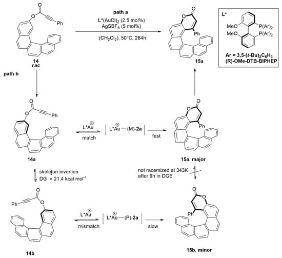 After a first racemic synthesis performed with Au(PPh3)Cl-AgSbF6 as catalyst, a screening of reaction conditions for the enantioselective version of the hydroarylation was examined. The study showed that in presence of 2.5 mol% of the chiral catalyst (R)-OMe-DTB-BIPHEP-Au(I) the desired hydroarylation occurs successfully via dynamic kinetic resolution at 50 °C, affording the desired product in 65% yield and ee > 85%. In these reaction conditions, the two enantiomers of 14 are rapidly interconverted while the chiral Au(I) catalyst can recognize one of these helical-enantiomers leading to the corresponding product (15a or 15b) configurationally stable because of the presence of the constructed α-pyrone ring.
