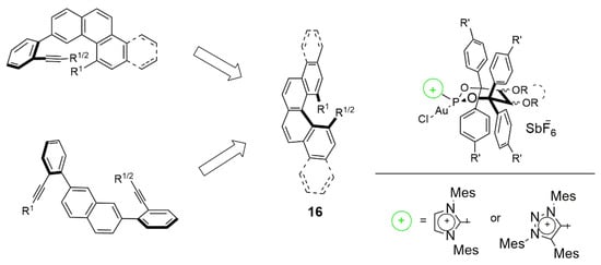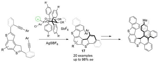 Very recently, the group of Alcarazo reported two other works about the intramolecular alkyne hydroarylation catalyzed by TADDOL-derived α-cationic phosphonites as ancillary ligands aimed to the enantioselective synthesis of 1,12-disubstituted [4] helicenes (16) (Figure 9) and dithia[5]helicenes (17) (Figure 10) [24,25]. These studies showed the potentiality of the developed catalytic system, which turned out to provide high enantiopure different helicene-systems.
