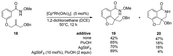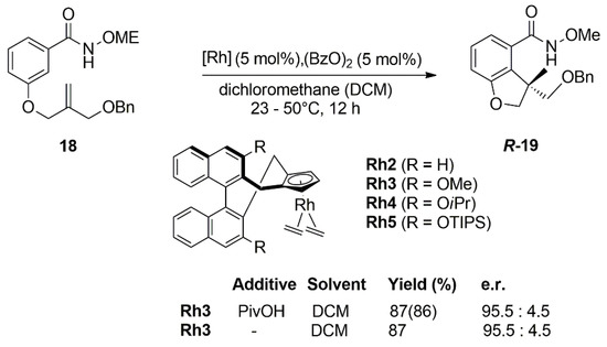 Rhodium-based catalysts are among the most commonly used systems in the C-C bond formation reaction thanks to their versatility and selectivity compared to other catalytic systems [26]. Called RCAA (Rh-catalyzed asymmetric arylation), a general Rh-catalyzed reaction starts with a transmetalation of an activated aryl group producing reactive aryl–rhodium. The intermediate then reacts with double or triple bonds to produce hydroarylated compounds or, in presence of an electrophile, the product of a RCAA-tandem reaction. Asymmetric arylation reactions between aryl- or alkenylboronic acids and olefins have been widely studied by Hayashi and co-workers since the 90s. Coordination of the hydroxorhodium complex with the chiral ligand leads to the [Rh(OH)(coe)2]2/(R)-segphos catalyst system affording the reaction under neutral conditions [27]. During the period of Hayashi’s research, a different system based on a Rh(III)-Cp* catalyst (where Cp* is a pentamethylcyclopentadienyl ligand) was employed by Cramer and co-workers for asymmetric C−H functionalizations [28,29]. While the asymmetric hydroarylation on 1,1-di- or tri-substituted olefins failed to undergo a reaction with rhodium acyclic intermediate pointing toward a weak binding to the metal or difficult migratory insertion, the reaction performed on allyl ethers (18) led to the synthesis of enantioenriched dihydrobenzofurans. The reaction performed with an achiral Cp*Rh(III) complex in absence of an additive furnished the cyclization products (19 and 20) almost without selectivity. Addition of a stoichiometric amount of pivalic acid and catalytic quantities of AgSbF6 provided 19 in 89% yield (Figure 11).