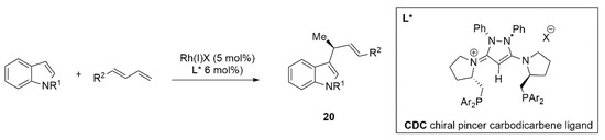 The same chiral catalyst (Rh3 in Figure 12) was used for the first time in oxidative coupling reactions by You’s group, providing the enantioselective synthesis of axially chiral biaryls in high yields and enantioselectivities (up to 99% yields and 98:2 enantiomeric ratio (e.r.)) [30]. The enantioselective addition of N-heteroarenes to terminal and internal 1,3-dienes catalyzed by an Rh catalyst was reported by Meek’s group in 2017. The employment of a new chiral pincer carbodicarbene ligand (CDC, Figure 13) afforded allylic substituted arenes (20) in excellent yields and enantioselectivities (up to 95% yield and up to 98:2 e.r.) [31].