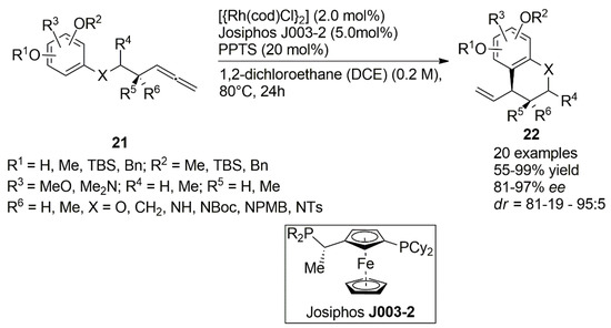 Rh-catalyzed intramolecular asymmetric hydroarylation was performed by Breit group on allenylbenzenes (21) for the synthesis of functionalized benzocycles (22) [32]. Employment of the catalytic system formed by Rh, Josiphos ligand (J003-2 in Figure 14), and pyridinium p-toluenesulfonate (PPTS), oxidatively added to the metal-ligand system, provides the enantioselective intramolecular addition of benzenes to allenes in good yields (Figure 14).