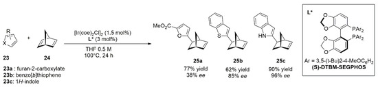 Between 2000 and 2010 the examples that reported use of Iridium-catalysts for hydroarylation reaction are few [33,34,35,36]. Among these, only one paper by Togni’s group reports an asymmetric version of the reaction describing the asymmetric intermolecular hydroarylation of norbornene with benzamide catalyzed by Ir(I) complexes [34]. In our first selected example, Ir-catalyzed asymmetric addition of heteroarenes to bicycloalkenes was reported in 2013 by Sevov and Hartwig [37]. After the screening of bisphosphine ligands, the intermolecular asymmetric addition of indoles, thiophenes, pyrroles, and furans to 24, as reported in Figure 15, is obtained in high yield and enantiomeric excess using the catalytic system [Ir(coe)2Cl]2 (coe = cyclooctene)—DTBM-Segphos (DTBM = 3,5-di-tert-butyl-4-methoxy). In all cases, C-C bond formation occurs at the position adjacent to the heteroatom.