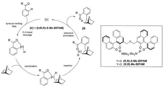 Similar bicycloalkene scaffolds were employed by Yamamoto and co-workers to provide alkylated acetophenone (26) and benzamide derivatives with good results [38]. After the optimization of the reaction conditions and the opportune choice of the ligand, the substrate scope disclosed that various substituents on the arene moiety were tolerated. In this reaction, mechanistic studies performed carrying out the reaction in presence of D2O showed that the turnover-limiting step is determined by the C-H bond cleavage (Figure 16).