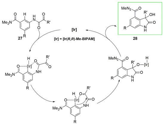 Between 2014 and 2015, Yamamoto published two other papers involving the use of Iridium and a chiral bidentate phosphoramidite ligand (Me-BIPAM) as a catalytic system for the intramolecular asymmetric hydroarylation of α-ketoamides (27) [39,40]. The reaction performed on α-ketoamides occurs with complete regioselectivity and high yields through the enantioselective addition at the C-H bond in the more hindered position in ortho respect to carbonyl group leading to optically active 3-substituted 3-hydroxy-2-oxindoles (28). The reaction scope and mechanistic studies have attested that the turnover-limiting step in the catalytic cycle is driven by carbonyl insertion to the aryl–iridium bond proven by 1H NMR experiments, kinetic isotope effect studies, and Hammett studies (Figure 17).