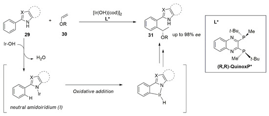 The asymmetric hydroarylation of vinyl ethers (30) catalyzed by a hydroxoiridium complex with chiral biphosphine ligands was reported by Yorimitsu’s group in 2017 [41]. The reaction was performed with good results on substituted azoles (29) with an N-H bond. The screening of the ligands revealed that (R,R)-QuinoxP* provides the best results for the synthesis of 31 both for the yields and the enantiomeric excess (Figure 18). As demonstrated by the unreactivity of N-methylbenzimidazole under the catalytic conditions, the bond formation between nitrogen and iridium is necessary for C-H activation through the C-Ir bond formation.