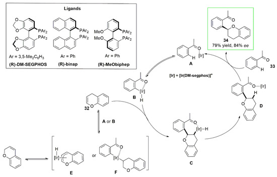 Two years later, Nishimura and Sakamoto reported the enantioselective synthesis of 2-arylchromanes (34) via olefin isomerization followed by asymmetric hydroarylation [42]. The reaction between 2H-chromenes (32) and aromatic ketones (33) performed with [IrCl(cod)]2 and (R)-DM-segphos, (R)-binap or MeObiphep ligands gave the product (34) in high yields and stereoselectivity. In this case, the coordination of Ir by oxygen leads to C-H activation of the aromatic ketone giving an aryl(hydrido)iridium(I) species B as reported in the catalytic cycle on Figure 19. The olefin isomerization of 2H-chromene into 4H-chromene can be promoted by species B or via π allyl complex F formation by allylic C-H activation. Irreversible carbometalation gives the alkyl-iridium intermediate C and finally the final product is achieved through the reductive elimination and A regeneration.
