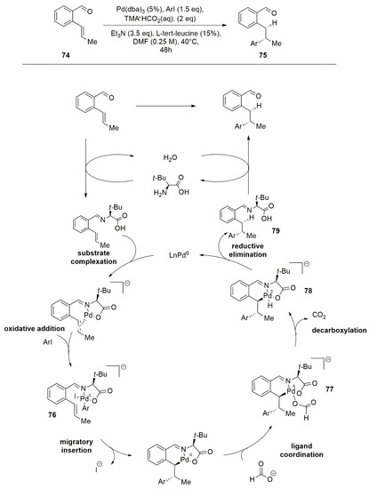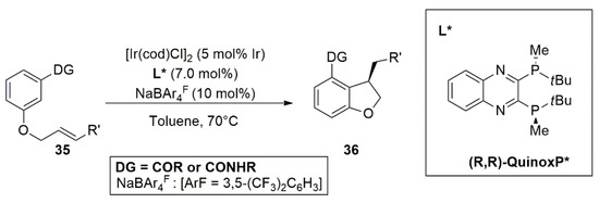 The effect of the aromatic keto- or amide-directing group in the enantioselective hydroarylation of olefins has been also described by Rueping and co-workers [43]. In this work, the reaction affords the synthesis of dihydrobenzofurans (36), important frameworks of biologically active compounds, with high yields and high enantioselectivity (Figure 20). After optimization of reaction conditions and a meticulous screening of ligands and substrates, a careful mechanistic study showed that the presence of the keto-directing group is essential because in its absence no reaction was successfully achieved.