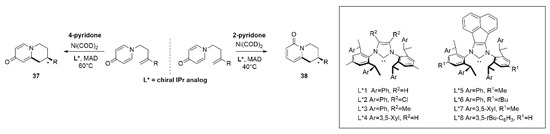 Examples of asymmetric C-H functionalization catalyzed by Ni(0) (usually as bis(cyclooctadiene)nickel complex) are very few and undeveloped before 2018. From the point of view of asymmetric and direct hydroarylation, the published works are very sparsely represented. Here we report the hydroarylation of alkenes allowing to final cyclized products. In detail, the enantioselective intramolecular hydroarylation of 2- and 4-pyridones catalyzed by Ni(0) was reported by Cramer and co-workers [44]. The employment of sterically hindered N-heterocyclic carbenes (NHCs) as chiral ligands derived from IPr (1,3-bis(2,6-diisopropylphenyl)imidazol-2-ylidene) allowed the synthesis of tetrahydroquinolizinones (37 and 38), an important scaffold of several biologically active compounds, in good yields and enantioselectivities (Figure 21).