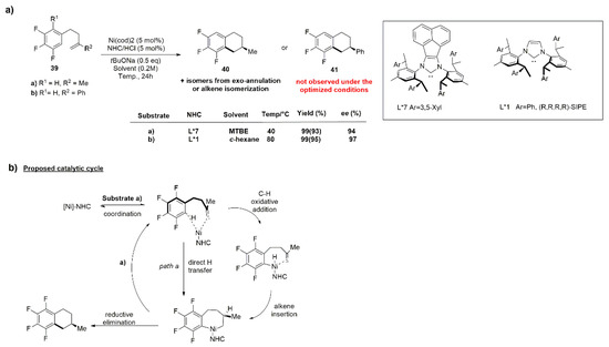The NHC ligands were also employed in the first example of catalytic enantioselective C-H functionalization of polyfluoroarenes (39) by Shi’s group in 2019 (Figure 22) [45]. A careful reaction optimization and screening of the ligands reveled that exclusive endocyclization occurs in excellent yields and enantioselectivity when ANIPE (L*5 and L*7, chiral version of IPr) or SIPE (L*1, chiral version SIPr) ligands are employed. The high regio-, chemo-, and enantioselectivity were achieved using chiral bulky NHC ligands on a variety of di-, tri-, and tetrafluoro alkenes, styrenes and enamines to produce valuable chiral fluorotetralins (40 and 41). The highly sterically demanding and electro-donating ligands employed in the reaction lead both the exclusive activation of C-H bonds over C-F bonds, and the challenging reductive elimination step and complete endoselective cyclization.