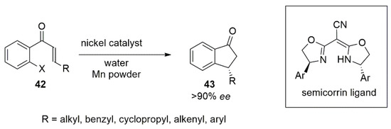 In the same year Shi’s work was published, Zhou’s group reported the stereoselective synthesis of indanones (43) through the Ni-catalyzed asymmetric intramolecular hydroarylation of enones (42) using a semicorrin ligand [46].