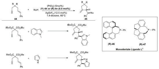 In the last subsection of the first part, few works that examine cobalt, platinum, and ruthenium catalysis are presented. In the selected time window, the only one work about the platinum catalysis involved in a hydroarylation reaction is reported by Toullec [47]. He describes a combinatorial approach aimed at the synthesis of libraries of chiral tris-ligated cationic platinum complexes and their evaluation as catalysts in the asymmetric hydroarylation/cyclization of 1,6-enynes (44). The evaluated catalysts are obtained by the combination of a mono- (L1) and a bidentate (L2) phosphorus ligand where at least one is chiral. The developed strategy allowed for the preparation of a library of 108 chiral [Pt(L1)(L2)]2+ type complexes. The study revealed that high enantioselectivities were obtained exclusively when there is a combination of ligands in which the monodentate ligand is chiral. The best results were achieved with monodentate ligands (L1) R-46 and R-47, (Figure 24) which have similar stereoelectronic properties: C2-symmetric dialkyl aryl phosphanes with medium cone angle and strong s-donating character.