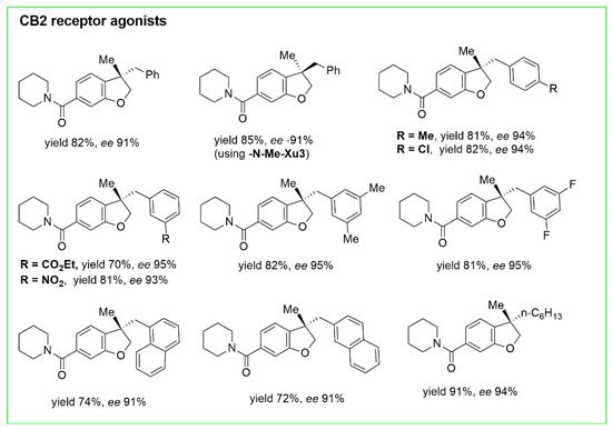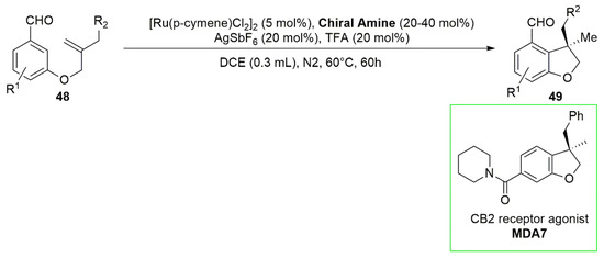 Looking for examples involving ruthenium as a catalyst for this type of reaction, our research has produced only one result reported by Wang and co-workers [48]. The work describes a ruthenium(II)-catalyzed asymmetric intramolecular hydroarylation assisted by a chiral transient-directing group in the enantioselective synthesis of chiral 3,3-disubstituted 2,3-dihydrobenzofuran (49) (Figure 25). The catalytic system involved a [Ru(p-cymene)Cl2]2 and a chiral amine. The developed catalytic system allowed to obtain the products bearing chiral all-carbon quaternary stereocenters in high yields (up to 98%) and high enantioselectivities (up to >99% ee). Total synthesis of CB2 receptor agonist MDA7 has been successfully achieved by using the developed protocol.