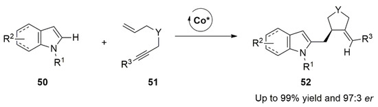 Finally, very recently two works about the use of cobalt in the asymmetric hydroarylation of alkynes and alkenes were reported by Lautens’ group [49] and by Shi’s group [50]. The work of Lautens describes an asymmetric hydroarylative cyclization of enynes (51) catalyzed by a Cobalt/(R,R)-QuinoxP leading to the formation of two new C-C bonds and one new C-H bond in excellent yields and excellent enantioselectivities as single diastereo- and regioisomers (Figure 26). After optimization of the reaction conditions, a wide variety of enynes (51) and N-substituted or aryl-substituted indoles (50) was screened, giving in almost all cases the corresponding product in excellent yields and ee (up to 99% yield and 94% ee).