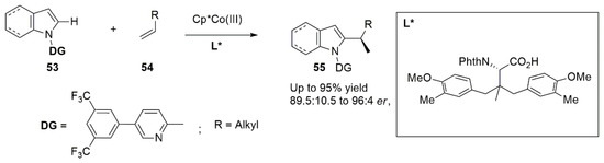 The following year Shi and co-workers reported the Cp*Co(III)-catalyzed asymmetric hydroarylation of unactivated aliphatic terminal alkenes (54) assisted by an amino acid-based bulky chiral carboxylic acid (CCA) ligand. The pivotal step was the stereoinduction driven by a noncovalent interaction arising from the molecular recognition among the organocobalt(III) intermediate, the coordinated alkene, and the suitable chiral ligand. Several C2-alkylated indoles and pyrroles (55) were produced in high yields and enantioselectivities (up to 95% yield and 96:4 e.r.) by exploiting the protocol which involved the use of a new type of bulky N-phthaloyl-protected amino acids (AAs) as a CCA ligand and the development of a new directing group (DG). Structure of ligand is in Figure 27. DFT studies showed that the role of molecular recognition with the organocobalt(III) intermediate is crucial for the chiral induction step. The designed amino acid differentiates the competing enantioisomeric olefin insertion pathways through noncovalent interaction determining the enantioselectivity of the process.