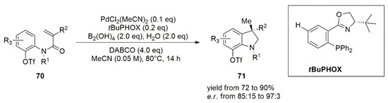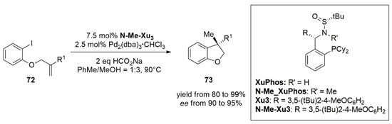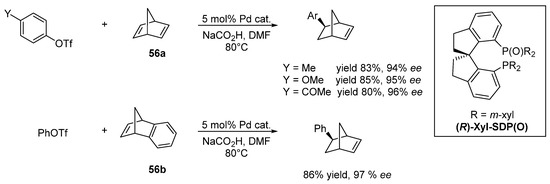 Reported for the first time by Cacchi and co-workers, the palladium-catalyzed hydroarylation between olefines and arylhalides or pseudohalides is formally known as a reductive Heck reaction [51,52,53,54]. Although its disclosure dates back to the 1980s, its asymmetric version has only been developed recently. Between 2010 and 2011 Sigman described the hydroarylation of dienes and styrenes trough the reductive formation of π-allyl palladium intermediates under oxidative conditions [55,56]. Despite the use of chiral ligands, only poor enantioselectivity was achieved. In 2013 Liu and Zhou reported the desymmetrization of substituted cyclopentenes through an asymmetric Heck reaction and the first highly enantioselective hydroarylation of bicyclic olefins (56a and 56b) with a Pd catalyst [57]. The ligand of choice for the asymmetric hydroarylation is the 1,1′-spirobiindane-7,7′-bisphosphine oxide,(R)-Xyl-SDP(O), belonging to the phosphine oxides family tested first for the Heck reaction, while the hydride donor was the sodium formate (Figure 28). For the first time in the asymmetric hydroarylation catalyzed by Pd, the reaction was achieved with high yields and ee up to 90% in all cases.