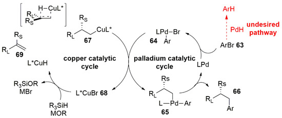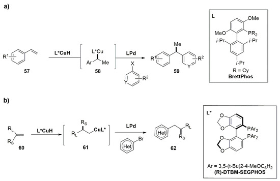 The combination of Cu and Pd as cooperative catalysis in the asymmetric hydroarylation or hydrocyanation is described by the works of Buchwald’s group [58,59,60]. The asymmetric hydroarylation of 57 and 60 leads to the synthesis of 1,1-diarylalkanes (59) and of arenes with β-stereogenic center (62).