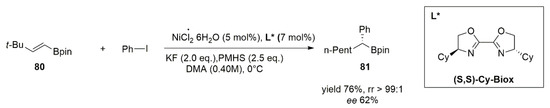 - Zhang, Y.; Han, B.; Zhu, S. Rapid Access to Highly Functionalized Alkyl Boronates by NiH-Catalyzed Remote Hydroarylation of Boron-Containing Alkenes. Angew. Chem. Int. Ed. 2019, 131, 13998–14002. [Google Scholar] [CrossRef]