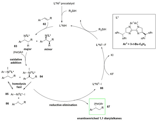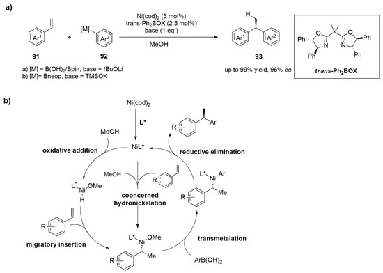 - Tran, H.-N.; Burgett, R.-W.; Stanley, L.-M. Nickel-Catalyzed Asymmetric Hydroarylation of Vinylarenes: Direct Enantioselective Synthesis of Chiral 1,1-Diarylethanes. J. Org. Chem. 2021, 86, 3836–3849. [Google Scholar] [CrossRef] [PubMed]