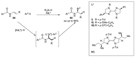 - He, Y.; Song, H.; Chen, J.; Zhu, S. NiH-catalyzed asymmetric hydroarylation of N-acyl enamines to chiral benzylamines. Nat. Commun. 2021, 12, 638. [Google Scholar] [CrossRef]