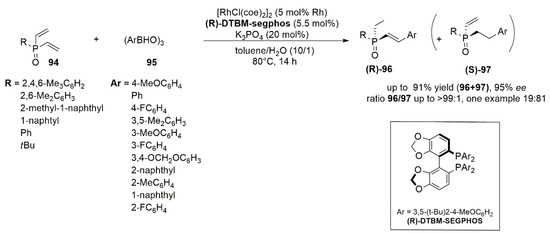- Wang, Z.; Hayashi, T. Rhodium-Catalyzed Enantioposition-Selective Hydroarylation of Divinylphosphine Oxides with Aryl Boroxines. Angew. Chem. Int. Ed. 2018, 130, 1718–1722. [Google Scholar] [CrossRef]