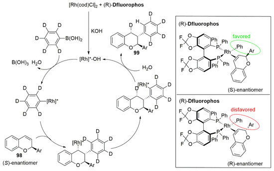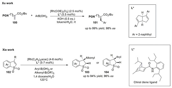 Analogously to the Zhu work about the employment of diboron–water species as a hydride source for the Pd-catalyzed asymmetric synthesis of disubstituted oxindoles, Xu and co-workers have recently developed a Rh(I)-diene catalytic system able to exploit water as proton source for the asymmetric hydroarylation of α-aminoalkyl acrylates (100) with boronic acids [83]. In the same year, Xia’s group developed an efficient protocol using a well-designed chiral Rh-diene catalyst with arylboronic acids and alkenylboronic acids in the enantioselective hydroarylation/hydroalkenylation of benzo[b]thiophene 1,1-dioxides (102) [84]. This protocol is free of base and additive, and it uses water as co-solvent. Structures of employed chiral ligands were in Figure 41 together with scheme of reactions.