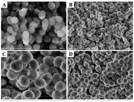 SEM images of Cu1.1@NS (A,B), Cu2.1@NS (C,D).