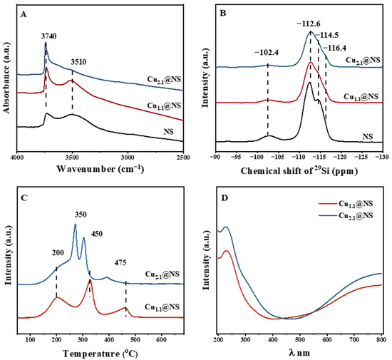 Characterization of Cu1.1@NS and Cu2.1@NS materials: (A) FTIR of dehydrated samples in the -OH vibration region; (B) 29Si MAS NMR; (C) TPR curves of calcined samples in 2% H2/Ar at a heating rate of 10 °C/min; (D) diffuse reflectance UV-Vis spectra of calcined and reduced material.