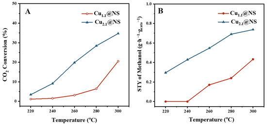 Catalytic test of CO2 hydrogenation in the fixed-bed microreactor in CO2/3H2 flow at GHSV = 2000 h−1 and 3 MPa over Cu1.1@NS and Cu2.1@NS materials: (A) CO2 conversion at various temperature; (B) space–time yield of methanol.