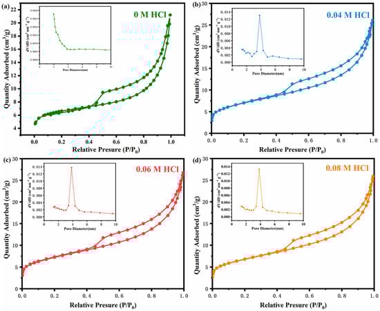 N2 adsorption–desorption isotherms of (a) sepiolite, (b) sepiolite modified by 0.04 M HCl, (c) sepiolite modified by 0.06 M HCl and (d) sepiolite modified by 0.08 M HCl. The insets are the corresponding pore size distribution plots.