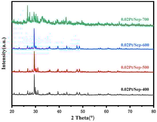 XRD patterns of 0.02Pt/Sep treated at different treatment temperatures from 400 to 700 °C.