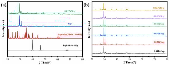 XRD patterns of (a) 0.02Pt/Sep, Sep, Sepiolite and Pt; (b) 0.01Pt/Sep, 0.02Pt/Sep, 0.03Pt/Sep, 0.04Pt/Sep, 0.05Pt/Sep and 0.06Pt/Sep.
