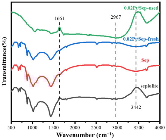 The functional groups present on the surfaces of sepiolite, Sep, 0.02Pt/Sep-fresh and 0.02Pt/Sep-used were determined by FTIR spectroscopy (Figure 4). The peaks after acid treatment were found at 1661 and 3442 cm−1, which were ascribed to δ (H2O) and the stretching vibration absorption peak of the OH group, respectively. There is a hydrogen bond between HCHO and the hydroxyl group [35], which can facilitate the adsorption of HCHO. Thus, the oxidation procession was accelerated. The similar characteristic peaks for Sep and 0.02Pt/Sep show the unaffected structure after Pt nanoparticle loading. The peaks attributed to H2O and OH− disappeared after HCHO exposure, which shows their involvement in the reaction (oxidation process), and the formation of a new peak at 2967 cm−1 is ascribed to the formate (CHO2−) species [27] on the sample surface as an intermediate.