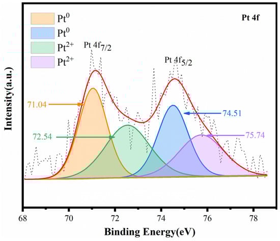 High-resolution XPS spectra of Pt 4f of the 0.02Pt/Sep sample are shown in Figure 5. The spectrum of Pt 4f can be fitted to Pt 4f7/2 (71.04 and 74.51 eV) and Pt 4f5/2 (72.54 and 75.74 eV) [36], because of their spin orbit interaction, matching with Pt0 and Pt ions (Pt2+ and Pt4+), separately.