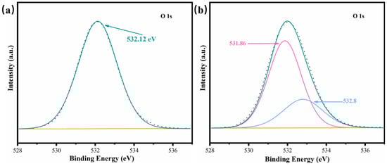 Figure 6 shows the O-1s XPS spectra of Sep and 0.02Pt/Sep. The presence of O in [SiO4] tetrahedra and [Mg(Al)O6] octahedra (532.1 eV) [37] is confirmed by the peaks in Figure 6a. The binding energy of O-1s in the 0.02Pt/Sep sample is shifted lower relative (531.86 eV) to Sep (Figure 6b). It indicates the electron density around the O atom due to Pt nanoparticle loading and proves the chemical bond between Sep and Pt, rather than the physical adsorption. The peak at 532.8 eV was attributed to water adsorption.