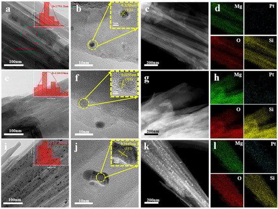 Figure 7 shows the Pt concentration’s effect on the morphology of Sep. The micrographs in Figure 7a,e,i prove the Pt nanoparticles’ distribution over Sep and show the fibrous structure of Sep. Meanwhile, for Pt nanoparticles attached to the fibers, the fibrous morphology was still retained. The nanoparticles’ size distribution on the fibers was very narrow, with a size of approximately 2.77 nm in diameter for the 0.01Pt/Sep sample. The 0.02Pt/Sep sample showed Pt nanoparticles with a 3.16 nm size distribution. Moreover, agglomeration is observed with the increase in Pt loading, as in the case of the 0.05Pt/Sep sample. The crystalline Pt nanoparticles on the above-mentioned three samples are depicted in Figure 7b,f,j. The measured lattice spacing associated with the (111) plane is 0.2285, 0.2253 and 0.2315 nm, respectively. Furthermore, the EDS maps corresponding to 0.01Pt/Sep, 0.02Pt/Sep and 0.05Pt/Sep are shown in Figure 7d,h,l, in which Mg and Si are associated with Sep, indicating the successful loading of platinum nanoparticles on the Sep surface.