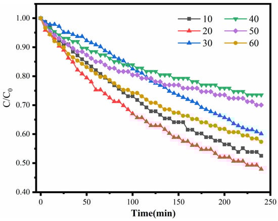 The catalytic oxidation of HCHO by the Pt/Sep catalysts with different Pt loadings at ambient temperature is shown in Figure 8 (the values of 10, 20, 30, 40, 50 and 60 correspond to concentrations of 0.01 M to 0.06 M of chloroplatinic acid solution). The 0.02Pt/Sep catalyst exhibited the highest HCHO oxidation efficiency (around 52%), whereas the 0.01Pt/Sep catalyst could partly oxidize the HCHO, by 47%. However, the adsorbed HCHO was hardly oxidized to CO2 due to the shortage of Pt nanoparticles. Moreover, the 0.03Pt/Sep, 0.04Pt/Sep, 0.05Pt/Sep and 0.06Pt/Sep catalysts possess certain catalytic ability for the oxidation of HCHO to CO2, but it is still lower than the efficiency of 0.02Pt/Sep. This is because excessive loading can cause the agglomeration of Pt nanoparticles [38], by which the reactive sites and active surface were reduced and the Sep nanofibers’ pores and tunnels were also blocked. This confirms the optimized Sep acid treatment with 0.02 M solution.