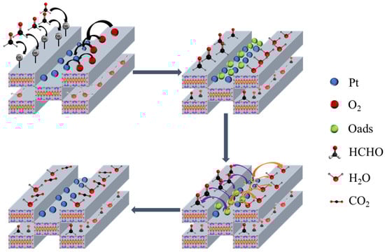 Figure 10 demonstrates a possible mechanism for the catalytic oxidation of HCHO with the 0.02Pt/Sep sample. Firstly, HCHO, H2O and O2 are adsorbed onto 0.02Pt/Sep. Moreover, O2 is excited by the Pt nanoparticles to oxygen radicals. Later, the oxygen radicals oxidize HCHO and H2O to dioxymethylene (DOM) and OH− ions, respectively. DOM reacts with -OH to create formate species, which further react with OH− to form CO2 and H2O. The OH− ions on the sepiolite surface are conductive to the adsorption of HCHO throughout the mechanism. The catalyst’s wettability plays a critical role in the desorption and transfer of water [40], by the current water forming reaction: