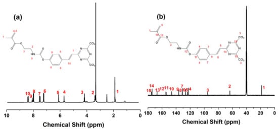 Triazine (MT) was first demethylated by boron tribromide (BBr3) to yield 4-(2-(4,6-Bis(trichloromethyl)-1,3,5-triazin-2-yl)vinyl)phenol (PT). PT was subsequently coupled with 2-isocyanatoethyl methacrylate to form polymerizable 2-(((4-(2-(4,6-bis(trichloromethyl)-1,3,5-triazin-2-yl)vinyl)phenoxy)carbonyl)amino)ethyl methacrylate (CT). Finally, CT was RAFT polymerized to yield a polymeric photoinitiator, pCT. The successful synthesis of CT was confirmed with nuclear magnetic resonance (1H NMR and 13C NMR), as shown in Figure 1. Specifically, H1, H4, and H5 proton signals in Figure 1a suggested the introduction of the methacrylate group, while the carbonyl group signal of C12 in Figure 1b indicated the formation of the carbamate.
