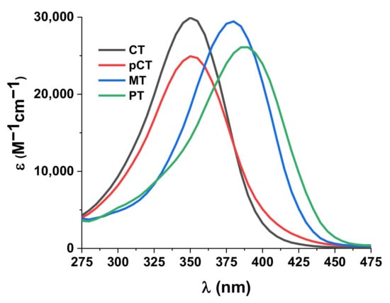 The maximum absorption wavelengths λmax, extinction coefficients εmax at λmax, ε400 nm at 400 nm, and ε410 nm at 410 nm of MT, PT, CT, and pCT in DMF.