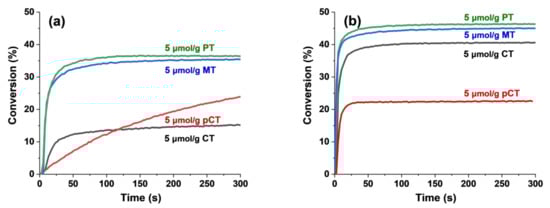 Photopolymerization profiles (double bond conversion vs. time) of TMPTA obtained in laminate in the presence of diverse equivalent triazine moiety concentration (a) pCT and (b) CT upon exposure to LED at 410 nm.