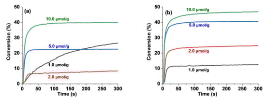 Additionally, the effect of light intensity and triazine moiety concentrations was investigated. As aforementioned, the increasing intensity of LED promoted the polymerization of TMPTA in the presence of identical photoinitiating systems in terms of both final double bond conversions and the Rp,max (Table 2). Moreover, except for the 1.0 μmol/g pCT formulation, the increased amount of triazine moiety from 1.0 to 10.0 μmol/g resulted in the increased final double bond conversion for both pCT and CT under the irradiation of LED at 410 nm (Figure 6). The distinctive TMPTA photopolymerization profile of 1.0 μmol/g pCT (Figure 6a) is attributed to the aforementioned steric effect.