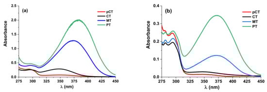 Infrared spectra of MT, PT, and CT were acquired using a Spectrum Two Fourier transform infrared (FTIR) spectrometer (Perkin Elmer, Waltham, MA, USA) fitted with attenuated total reflectance (ATR) accessory scans, with an average over the range of 500–4000 cm−1 at the resolution of 4 cm−1.
