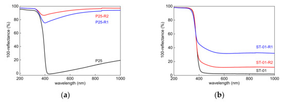 The successful preparation of reduced/hydrogenated titania has been easily observed by the intense coloration of the prepared samples, as shown in Figure 1f. Although most samples are black, the color of the ST01-based samples is much lighter (gray). The photoabsorption properties of the prepared samples, examined by diffuse reflectance spectroscopy, are shown in Figure 1a–e. The DRS spectra confirm the visual observation of samples’ coloration, i.e., the black-colored samples absorb a wide range of vis-NIR light with high intensity, whereas the gray-colored samples show lower absorbance in the vis-NIR region. The significant difference in color between the ST01-based samples and the others indicates insufficient reduction (uncompleted reaction), probably resulting from a large difference in surface properties, because the ST01 sample is characterized by a much larger specific surface area (ca. 300 m2 g−1) than the other samples, e.g., ca. 59 m2 g−1 for P25. Moreover, this also suggests that the modification of titania (reduction with NaBH4) is rather on the surface than in the bulk.