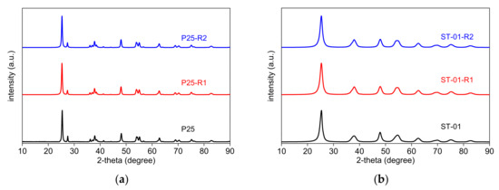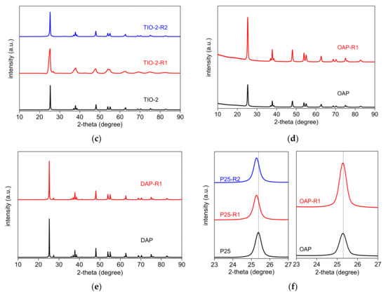 The crystal properties of all samples (Figure 2) were largely unchanged after the reduction. All samples contain mainly anatase phase (Rigaku, Tokyo, Japan PDXL PDF card: 5757), as clearly observed by characteristic peaks at ca. 25.31°, 37.79°, 48.04°, etc., relating to the (101), (004) and (200) planes, respectively. Additionally, P25 also contains rutile phase (Rigaku PDXL PDF card: 7814), as could be seen from the peaks at ca. 27.63°, 41.45°, 54.65°, 69.48°, etc., relating to the (110), (111), (211), (301) planes, respectively. In the case of all commercial samples, a slight shift of the diffraction peaks to lower angles has been observed (Figure 2f for P25), indicating the formation of oxygen-deficient TiO2−x [54]. However, the shift is almost undetected in the case of the faceted samples (OAP and DAP), as shown for OAP in Figure 2f. This is not surprising as faceted samples are highly stable, and thus their bulk modification is very difficult, i.e., usually “surface” self-doping is achieved (our own unpublished data and [55]).