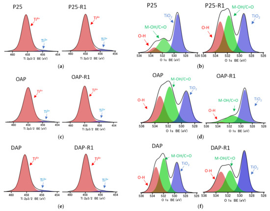 XPS data after deconvolution of titanium (a,c,e) and oxygen (b,d,f) peaks for pristine (on the left) and reduced (on the right) titania: (a,b) P25 and P25-R1; (c,d) OAP and OAP-R1; (e,f) DAP and DAP-R1.