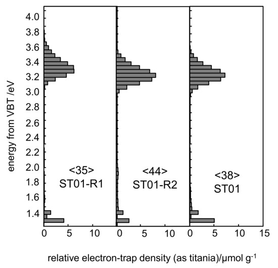 Additionally, the total density and distribution of electron traps (ETs) were analyzed by photoacoustic (PA) and reverse-double beam PA (RDB-PAS) spectroscopy for the ST01-based samples. The obtained data are shown in Figure 4. The distribution of ETs and total density of ETs (38, 35 and 44 μmol/g for ST01, ST01-R1 and ST01-R2, respectively) are both very similar in the pristine and modified samples, indicating that the content of ETs changed little during the modification, similarly to the XPS results (Ti3+). Only, in the case of the ST01-R2 sample, additional ETs could be observed at ca. 1.8–2.0 eV above the valence band, probably correlating with the bridging proton in titania (Ti–H [61]). Therefore, an additional method (photochemical [62]) has also been applied to investigate the total content of defects in the pristine and modified titania samples. Using this approach, finally, a significant difference between samples could be found, as shown in Table 2. An increase in the density of defects was obvious after titania thermo-chemical reduction (three- to six-fold increase in defect density), especially for the black samples.